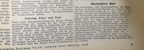 In einem Magazin wird am 11. 02. 1950 über die Ferienmöglichkeiten berichtet: "Doch unsere bayrischen Kollegen haben schon seit langer Zeit Ferienheime wieder in eigener Verwaltung. In den landschaftlich schönsten Gegenden der bayrischen Berge stehen die Erholungsheime Raintaler Hof bei Garmisch-Partenkirchen und Hallthurn bei Bad Reichenhall den Kollegen wieder zur Verfügung. Für die Jugend sind mit der Winklmooshütte bei Reit im Winkl, dem Jugendheim Raintaler Hof und der Suttenhütte ganz besondere Ferienmöglichkeiten für Sommer und Winter geschaffen. Hier können Jugengruppen zu ganz billigen Preisen ihren Urlaub gemeinsam verbringen." |