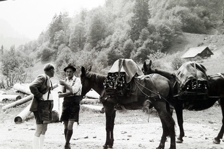 Hier kommt Holz - aber das wird von den Mulis in die falsche Richtung gezogen. So wurde noch in den sechziger Jahren das Holz durch den Forst abtransportiert. |