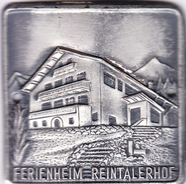 Ein Fundstück von 2019: Ein rechteckiger Stocknagel in silberfarbener Ausführung. Dargestellt der Reintalerhof in seiner Außengestalt um 1950 oder etwas später. Das Brünnerle ist da und das Eingangsportal und - natürlich - die Alpspitze wieder malerisch rechts vom Hof in Szene gesetzt. (Nach wie vor frage ich mich, ob denn jemals jemand aufgefallen ist, dass die Alpspitze nord-westlich vom Reintalerhof zu sehen ist und nicht an den Stellen, an denen der markante Berg auf den Postkarten, etc. hinmontiert ist.) |