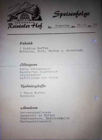 | Kaffee, Brötchen, Brot, Butter und Marmelade gab's zwischen Weihnachten und Silvester 1953. Und andere Leckereien auch ... - Die Speisekarte vom 29. Dezember 1953. |