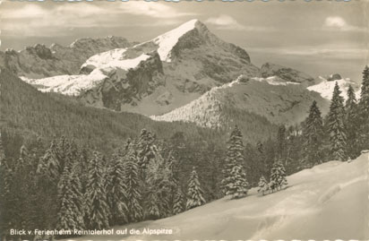 Ein Karte, ungelaufen, wohl aus den 60er-Jahren. Äußerst interessant - Bislang wuchtete sich hinter dem Reintalerhof die Alpspitze auf (s. oben). Nun ist sie verschwunden. Wie auch immer. Anhand der Bäume lässt sich das ungefähre Alter der Aufnahmen gut erkennen. Und wer's bis hier noch nicht weiß, die Alpspitze war und ist westlich des Reintalerhofs und diese Ansichten hier schauen immer nach Osten. |