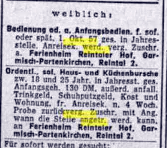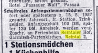 | Am 23. 4. 1955 wird in der Passauer neuen Presse - Niederbayerische Zeitung ein tüchtiger Küchenbursche gesucht. 100 DM soll er als Lohn bekommen, bei freier Kost und Logis. | ![]() |