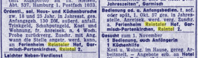 Am 7. Dezember 1946 berichtet die Mittelbayerische Zeitung in ihrer Ausgabe No. 108 über eine Konferenz zur deutschen Jugendfrage. In diesem Beitrag wird auch über die Gewerkschaftsjugend geschrieben und über den Reintalerhof ("ein wunderbarer Hochgebirgshof, inmitten der herrlichsten, alpinen Landschaft"), der der Jugend als Erholungsheim zur Verfügung steht. |