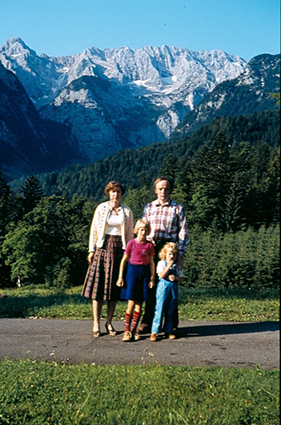 Familie Schönbeck, die damaligen Hausverwalter, mit Gästen vor der imposanten Kulisse des Wetterstein. |