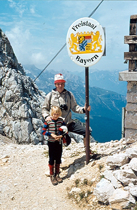 Aufstieg geschafft, die Meilerhütte ist erreicht. Zeit für eine ausgiebige Brotzeit, denn der Weg vom Reintalerhof bis zu Hütte schleppt sich. Herr Wehrhahn mit Tochter im Sommer 1982. |