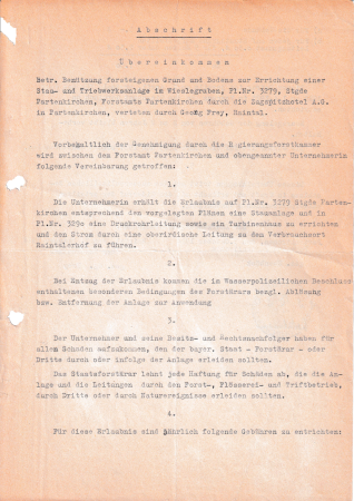 Am 3. Oktober 1924 wird eine Vereinbarung zwischen dem Forstamt Partenkirchen und dem Unternehmer Georg Frey, Zugspitzhote A. G. Es wird vereinbart, dass die Zugspitzhotel A.G. forsteigenen Grund und Boden zur Errichtung einer Stau- und Triebwerksanlage im Wieselegraben, Pl. Nr. 3279 errichten darf. An Kosten werden dafür jährlich 7,50 Mark berechnet.