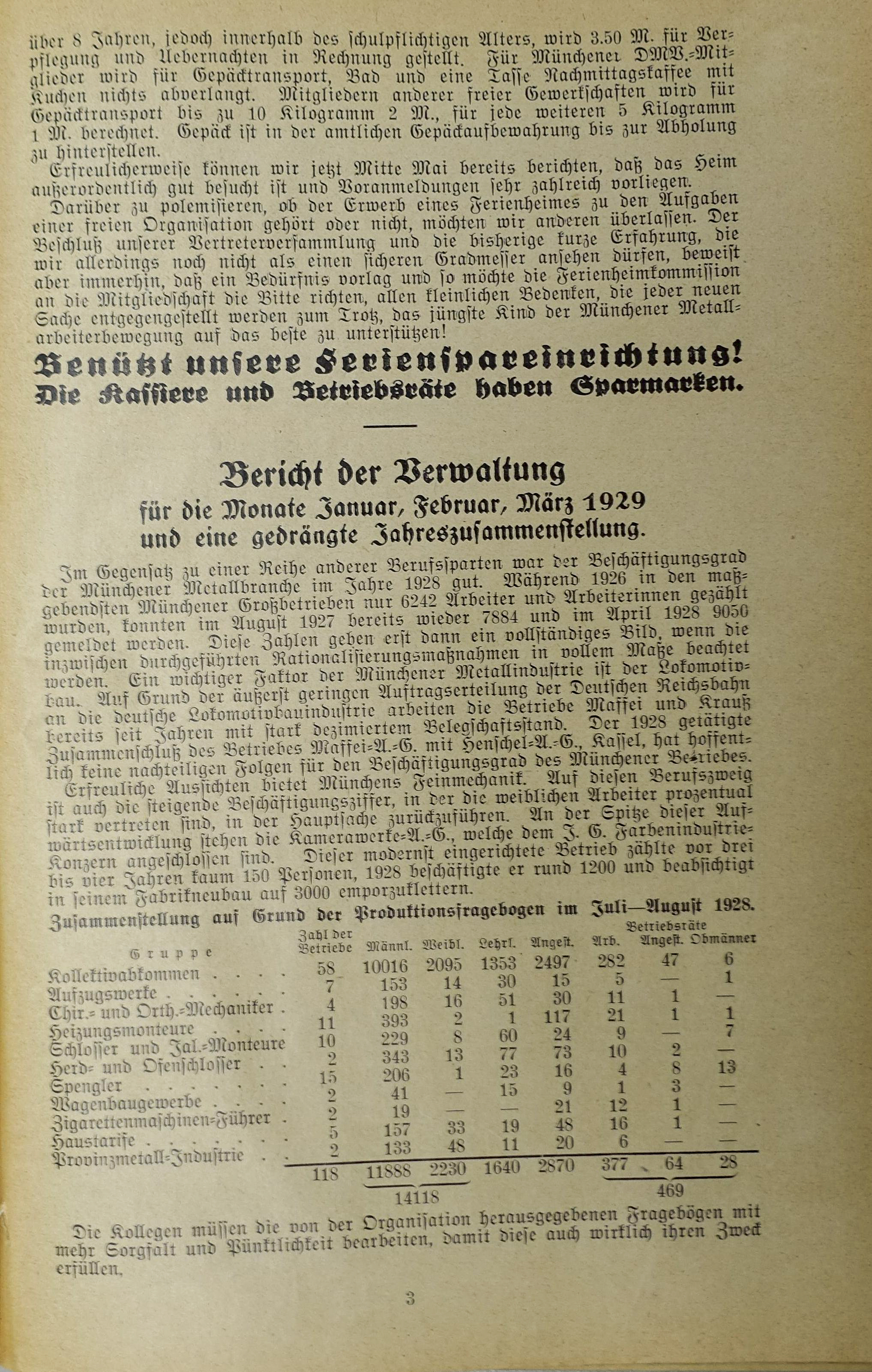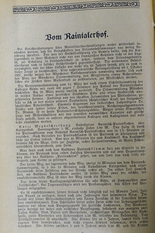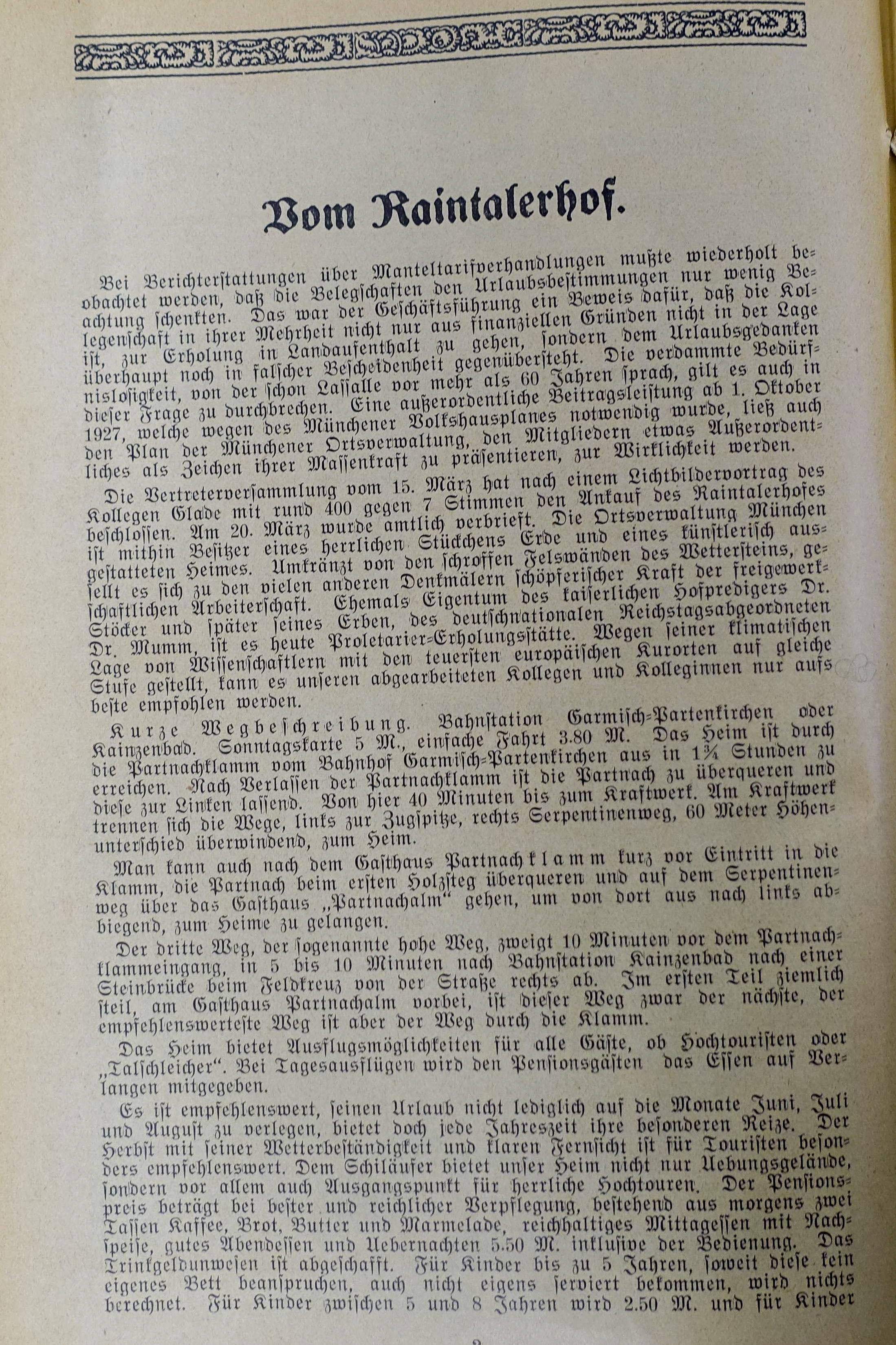 "SPD. Auch in den bayerischen Bergen gibt es Erholungsstätten, die nach dem wissenschaftlichen Urteil berühmter Hygieniker den Vergleich mit den winterlichen Sonnenkurplätzen der Schweiz sehr wohl aushalten. Dazu zählt in erster Linie der Raintalerhof, das Ferienheim des Deutschen metallarbeiterverbandes, das 2 1/2 Wegstunden oberhalb Garmisch-Partenkirchen an einem sonnenbestrahlten Südhang liegt. Die klare waldwürzige Winterluft macht den Aufenthalt zu einem wahren Gesundheitsborn. Der Freund des Wintersportes hat hier unerschöpfliche Gelegenheit zur Betätigung. Vom 8. Februar bis einschliesslich 15. März werden kostenlos ständige Skikurse für Anfänger und Fortgeschrittene unter Leitung sorgfältig ausgebildeter und geprüfter Skilehrer des Touristenvereins "Die Naturfreunde" durchgeführt.